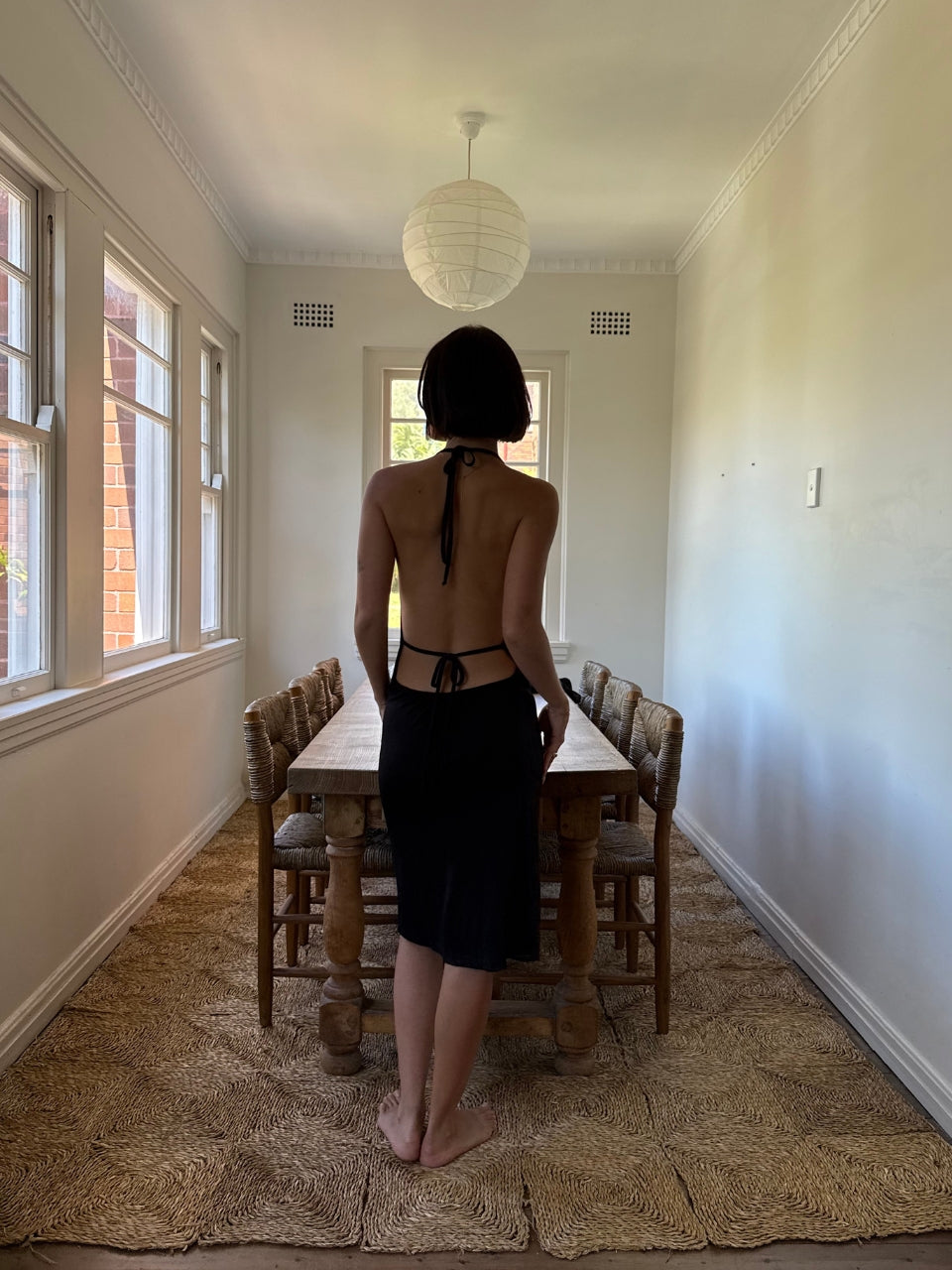 - Adjustable ties at the waist and neck